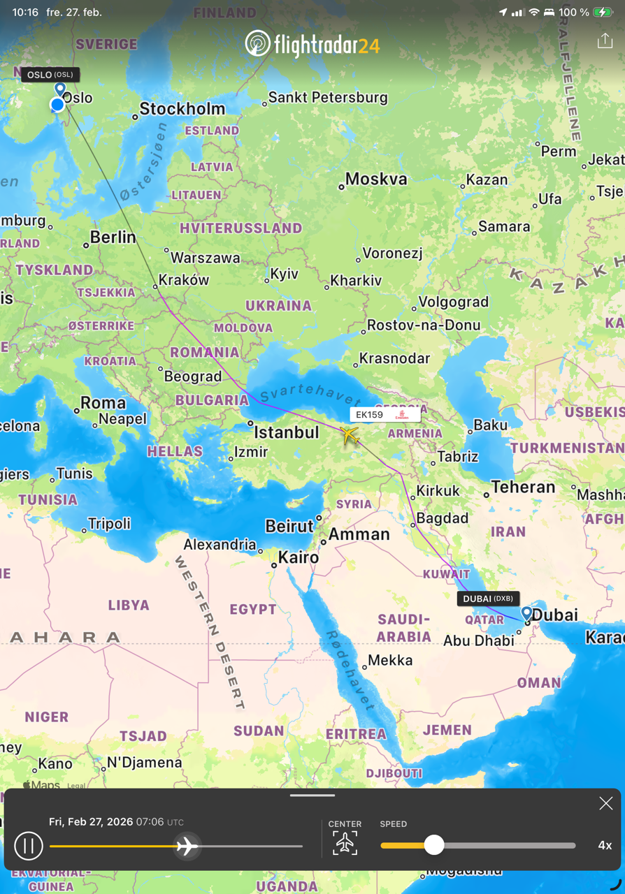 Maybe Emirates was listening, because this morning it didn’t route its Dubai-Oslo schedule (EK159) through Iran and Russia as it did yesterday. Instead it took the route pictured below (courtesy of Flightradar24).