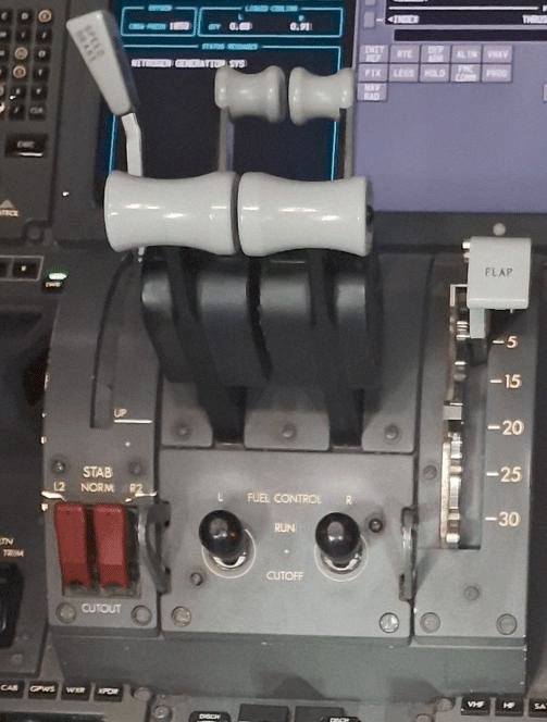 There are two FCSs, one for each engine in a 787. They have two settings: Cut Off and Run. The first act by any crew in starting a 787’s engines on the ground is to set the switches to Run. On the ground or in the air, setting the switches to Cut Off stops the fuel flow to the engines. (See photograph below, showing the switches just behind and below the engine power levers)
