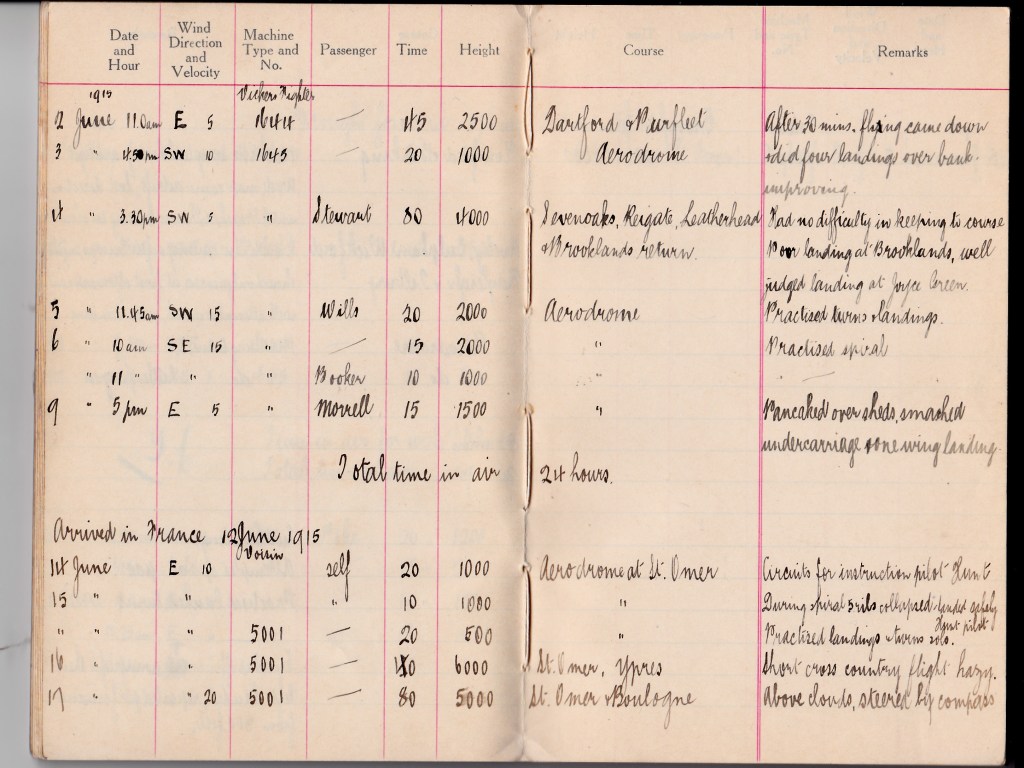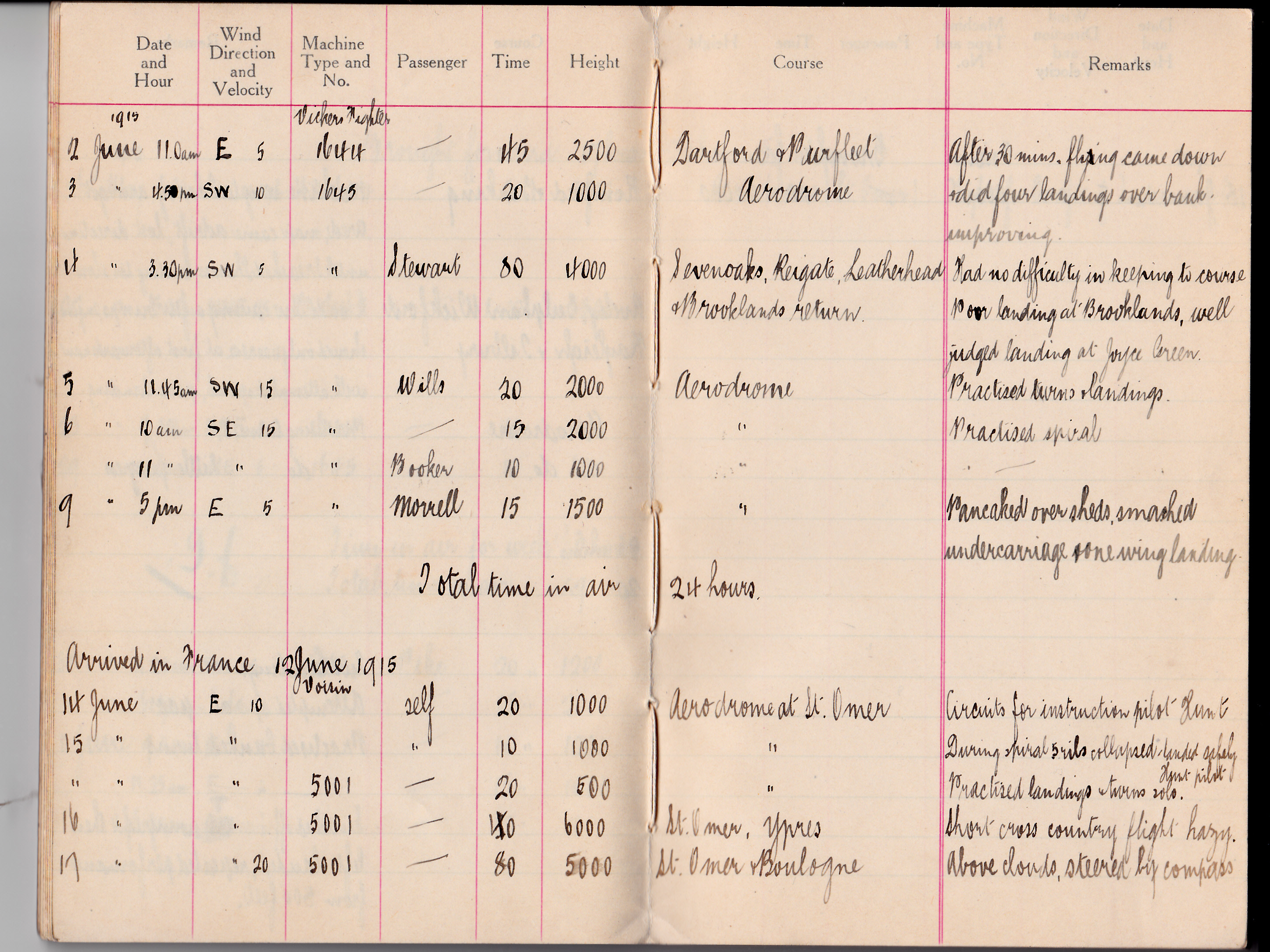 At the end of my grandfather’s training course in June 1915, his flying log book recorded exactly 24 hours airborne time. To train for a private pilots licence today you would need 35 hours or more to gain the necessary skills to satisfy the examiner, and today’s aeroplanes are far more reliable and much easier to fly.